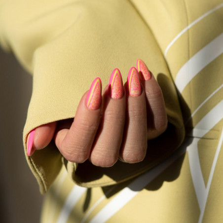 Confetti Braziliusz contient des particules de couleur rose, orange et verte. Laissez parler votre imagination et créez des manucures de toutes les couleurs avec ces fines paillettes colorées.