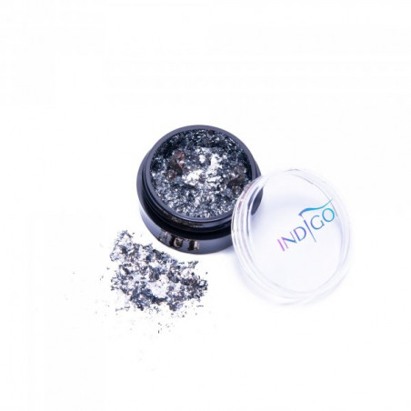 flakes voor decoraties in de vorm van kleine glinsterende bloembladen in een donkere zilveren tint. Hiermee kunt u het effect bereiken van een onregelmatige zilverfolie ook wanneer u het toepast op bepaalde stijlen, wordt het de perfecte aanvulling op meer delicate nailart.
