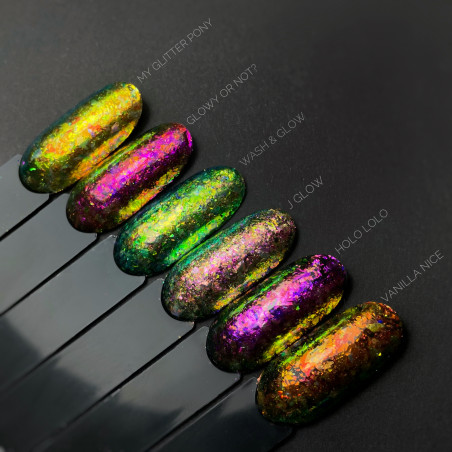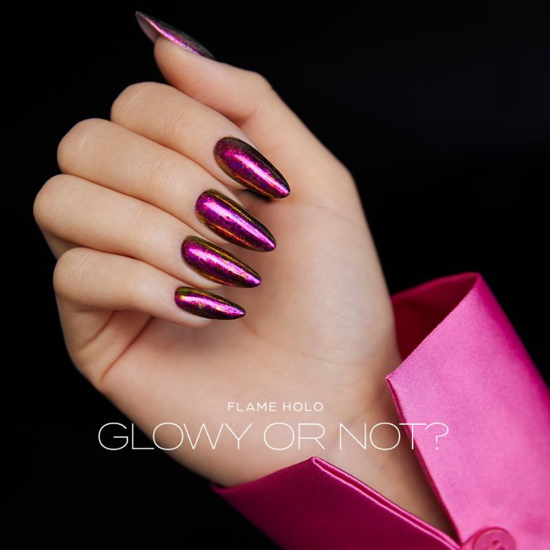 Kleine doorschijnende schilfers met een sprankelende glans die u het effect geven van een onregelmatig, glinsterend blad op uw nagels. Tik het flame effect op de kleverige laag van de kleur of Effect base en krijg een betoverd resultaat.