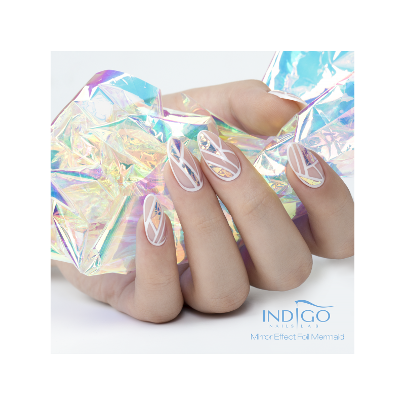 Mermaid Mirror Effect Foil is een glinsterende folie die het effect geeft van zilveren en paarse glazen nagelsSnijd het in kleine reepjes en leg ze op een laag eiwitbasis om ze te korsten. Een andere stijl dan de Transfer Foil!