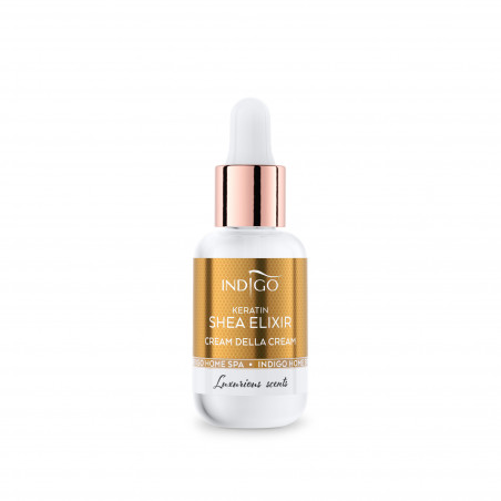 Cream Della Cream Shea Elixir met keratine uit de Indigo Home Spa lijn is een luxe product dat de conditie van de haarschubben en nagels zal verzorgen. De emulsie in een praktische fles zal de zorg ondersteunen en uw handen omwikkelen met een sensueel aroma.