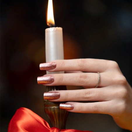 Elfira, uit de Winter 2024 Collectie, is een glitterende roze-gouden gelpolish die zachtheid en schittering combineert. De subtiele gouden tint, verrijkt met glitter, verlicht je nagels voor het winterseizoen. Elfira is gemakkelijk aan te brengen en langhoudend, perfect voor feestelijke manicures of verfijnde looks.